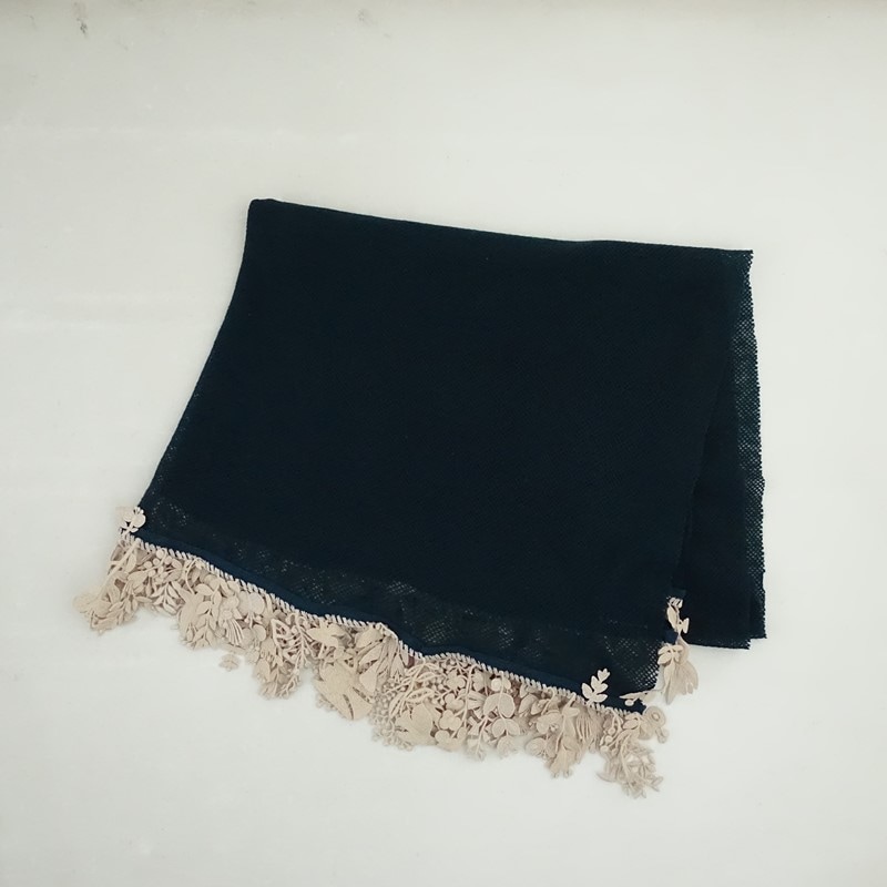 カラーなど:2025年AWコレクション、mina perhonenのforest parade メッシュストールです。カラーはダークグリーンのメッシュ地で、両サイドにベージュのforest paradeのレースモチーフがあしらわれています。素材はカシミヤ100%、刺しゅう部分上糸が綿100%、刺しゅう部分下糸がポリエステル100%で、定価(メーカー希望小売価格)71,500円の商品です。