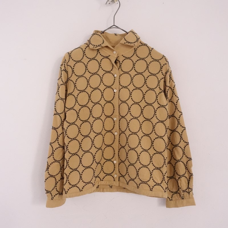 カラーなど:minaのtambourine ウールブレンド刺繍シャツです。カラーはベージュ×チャコールグレーで「tambourine」の総柄刺繍があしらわれております。コンパクトなサイジングで、フロントボタン開閉で着脱できます。