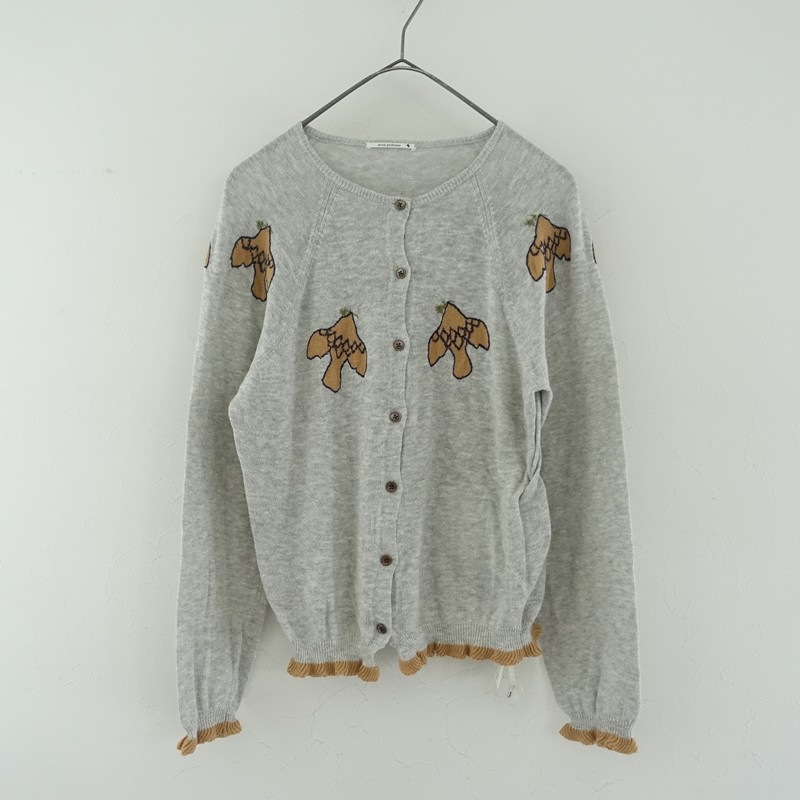カラーなど:mina perhonenのodyssey ニットカーディガンです。カラーはグレーで、odysseyテキスタイルの施された薄手のニット地で仕立てられています。ボタン開閉で、定価(メーカー希望小売価格) 37,800円の商品です。