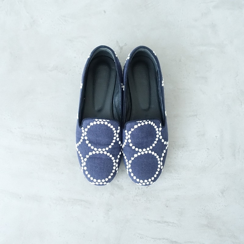 カラーなど:mina perhonenのtambourine スリッポンシューズです。カラーはネイビーベースにオフホワイトでtambourineのテキスタイル刺しゅうが施されたデザインで、履き口にパイピングが施されています。