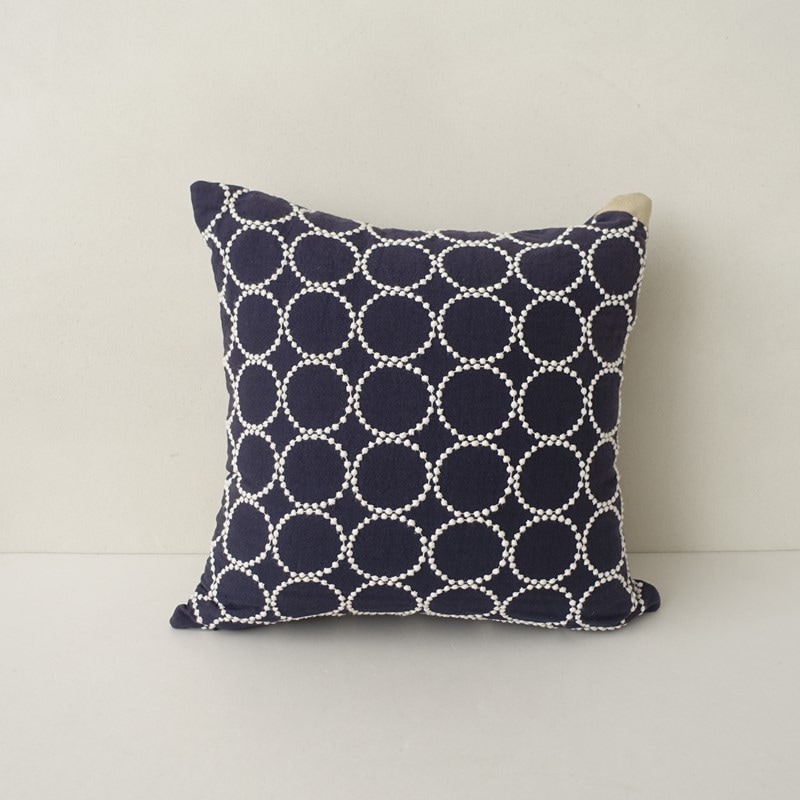 カラーなど:mina perhonenのtambourine クッションカバーです。カラーはネイビーべースにオフホワイトでテキスタイル刺しゅうがあしらわれており、ジッパー開閉です。素材は表生地が綿50%,麻50%、刺しゅう部分と裏生地が綿100%、部分的に人工皮革が使用されており、ヌードクッションは付いておりません。