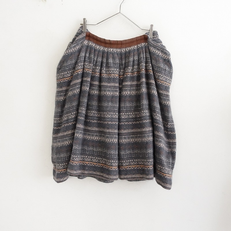 デザイン:mina perhonenのslow アンゴラ起毛フレアスカートです。カラーはグレーにグレーベージュ・オレンジ・ブルーグレーの総柄織で、厚手の起毛素材です。ウエスト前後中央はブラウンの光沢ある別布に切り替えられており、タック入りのフレアデザインです。バックのフック&ファスナーで着脱でき、腰両サイドにループボタン留めのポケットがあり、裏地付きです。