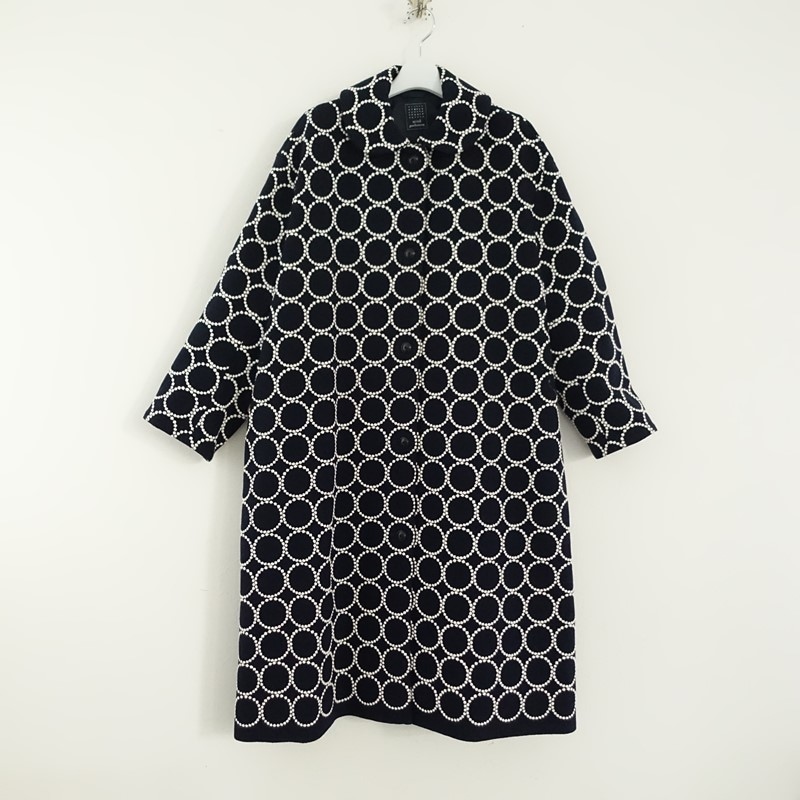 カラーなど:mina perhonenのtambourine 刺しゅうウールロングコートです。カラーはネイビーで、tambourineのテキスタイル刺しゅうがあしらわれたウール地で仕立てられ、裏地付きです。ボタン開閉で、両サイドにポケット付き、定価(メーカー希望小売価格) 176,000円の商品です。