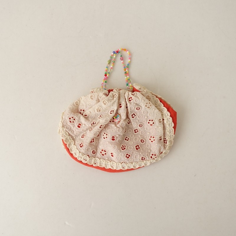 カラーなど:mina perhonenのsun moss こども用バッグです。オレンジの生地に「sun moss」のテキスタイルが施されたアイボリーのレースが前後にデザインされております。ゴムの開閉で、フロントには、ビーズで作られたモチーフが付いており、同ビーズで持ち手が作られている、かわいいデザインです。