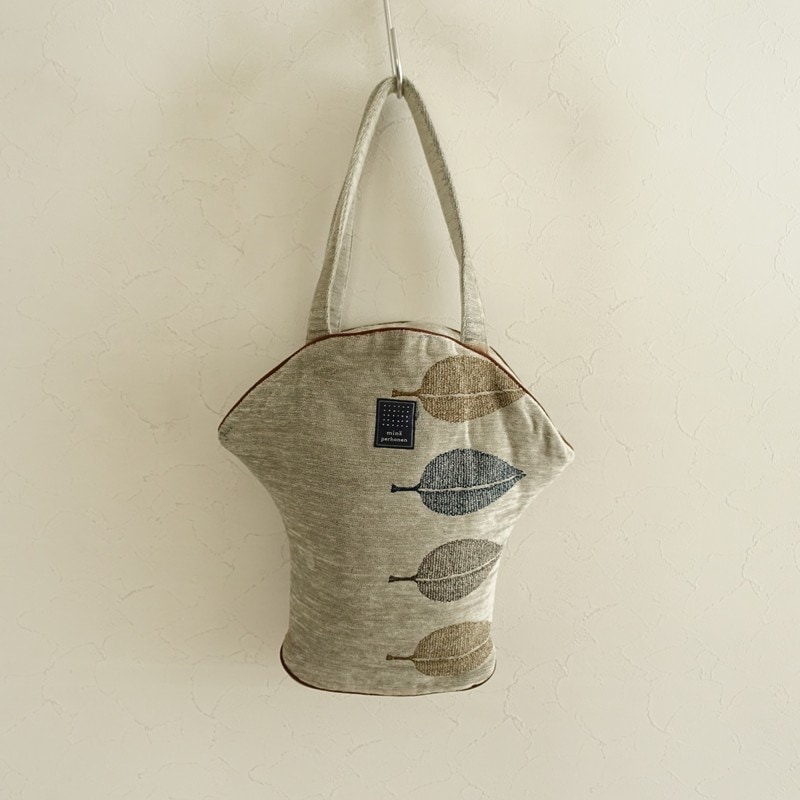 カラーなど:mina perhonenのhappa マフィンバッグです。カラーはグレーベージュ系のモール地ベースにネイビー・ダークブラウンなどの葉っぱのテキスタイル刺しゅうがあしらわれており、ブラウンのパイピングが施されたデザインです。開口部はファスナー開閉で、内側はダークブラウンの裏地&オープンポケットが1つ付いており、素材は表地がアクリル46%,綿32%,毛14%,ポリエステル8%、レースと裏地が綿100%です。