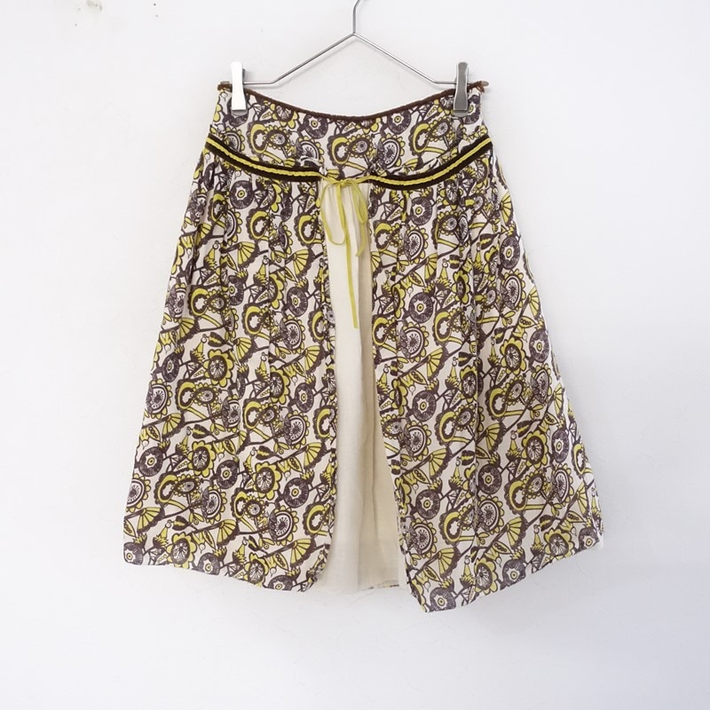 カラーなど:mina perhonenの「joy」プリントガーゼラップレイヤードギャザースカートです。カラーはクリーム無地&ブラウン・イエローなどの柄地です。コットンとカシミヤの柔らかな甘い平織りガーゼ生地を使用。無地とプリントとのレイヤード仕様で、滑りの良い裏地付きで仕立てられています。左のジッパー開きで、フロントラップ部分はボタンループ&リボン留めです。ウエストの縁はフリンジのパイピング、フリルや裾の縁はピコカット。本体・ラップ布共にギャザーがあしらわれております。ポケットはございません。