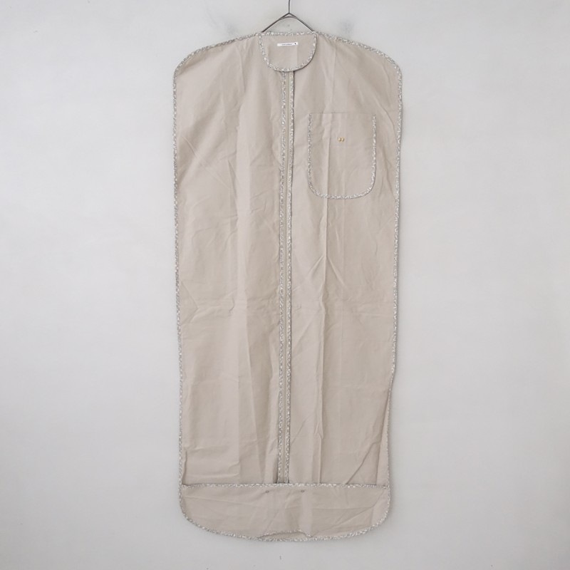 カラーなど:mina perhonenのコートカバーです。カラーはライトベージュで「sleeping rose」のパイピングが施されています。 開口部はファスナー開閉で、フロントに「choucho」の刺しゅうが入ったオープンポケットが1つ付けられたデザインです。