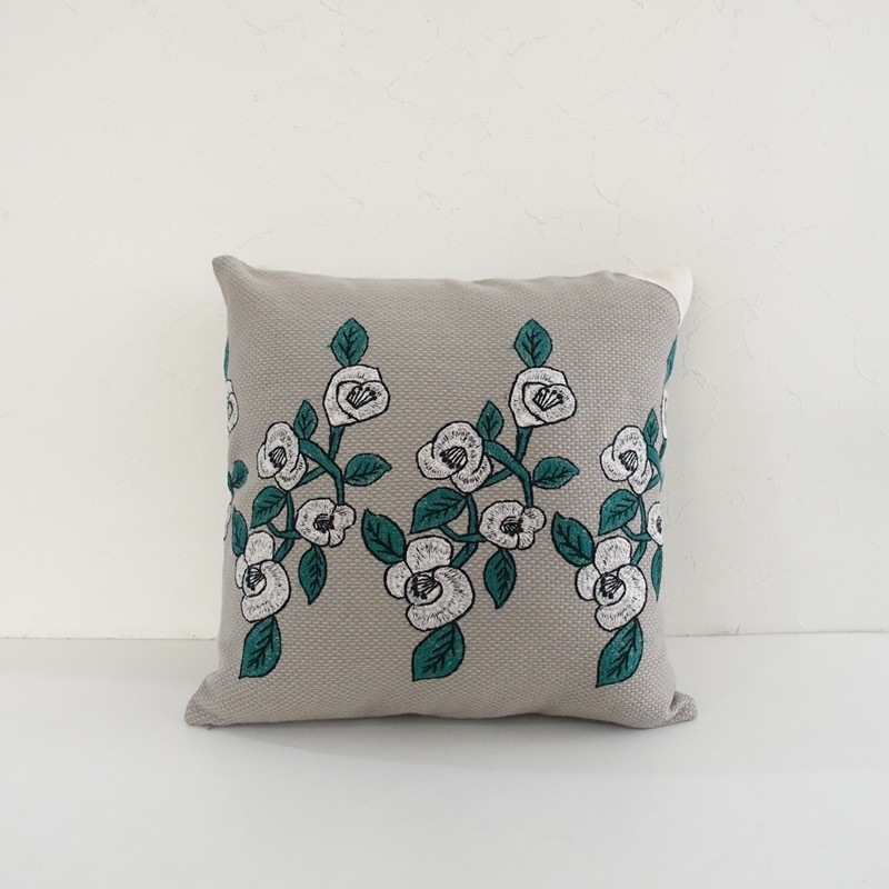 カラーなど:mina perhonenのswing camelia クッションカバーです。ライトベージュとライトグレーの織生地ベースに、ホワイトとグリーンで「swing camellia」のテキスタイル刺しゅうがあしらわれており、程よい厚みのある質感に仕上げられております。お部屋の雰囲気を手軽に変えられるアイテムです。尚、ヌードクッションは付属しておりません。