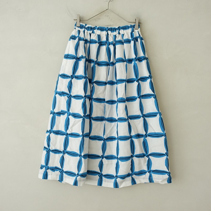 カラーなど:2025年SSコレクション mina perhonenのsolmio ギャザースカートです。カラーはホワイト・ライトブルー・ネイビーで、テキスタイルプリントが施された少しコシのある薄手素材です。ウエストラインに平ゴムが通ったイージータイプで、ウエスト周りにギャザーがあしらわれております。左右ウエストにシームポケットがあり、ホワイトの裏地付きです。定価(メーカー希望小売価格)72600円の商品です。