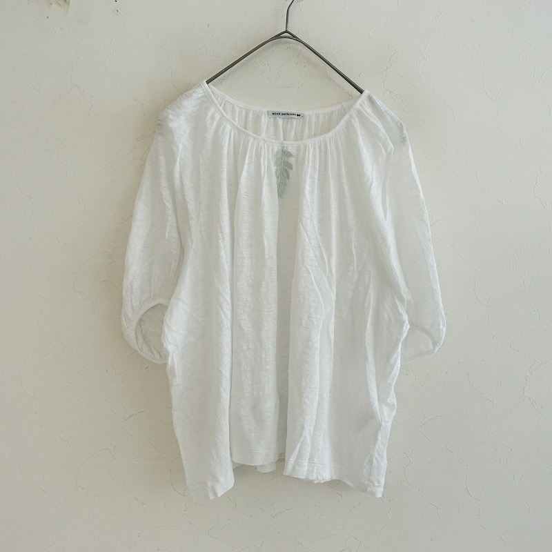 カラーなど:mina perhonenのpousse リネンカットソーです。カラーはホワイトで、透け感のある薄手のリネンカットソー地で仕立てられています。プルオーバータイプで、衿ぐりや袖口にギャザーがあしらわれ、forest parade の刺しゅうモチーフがアクセントです。定価(メーカー希望小売価格) 26,400円の商品です。