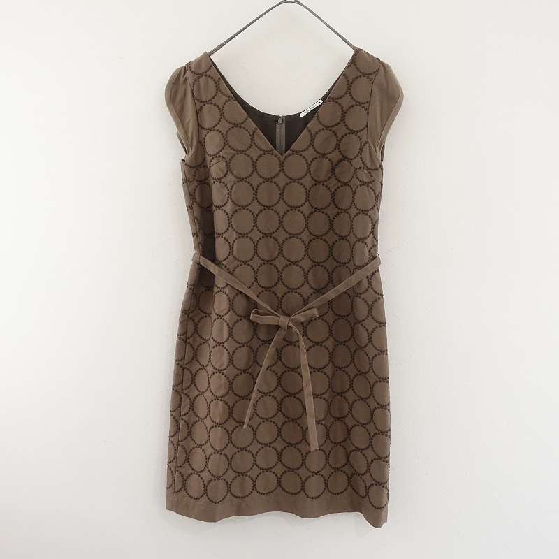 カラーなど:mina perhonenのtambourine コットン刺しゅうブワンピースです。カラーは濃いめのブラウンのやや薄手素材ベースにダークブラウンのテキスタイル刺しゅうがあしらわれております。バックセンターホック&ファスナー開閉式で、左右ウエストにベルトループがあり、ベルト紐が付属しております。袖は縁にパイピンクが施され肩部分はスリットデザインになっており、袖部分以外は裏地付きです。