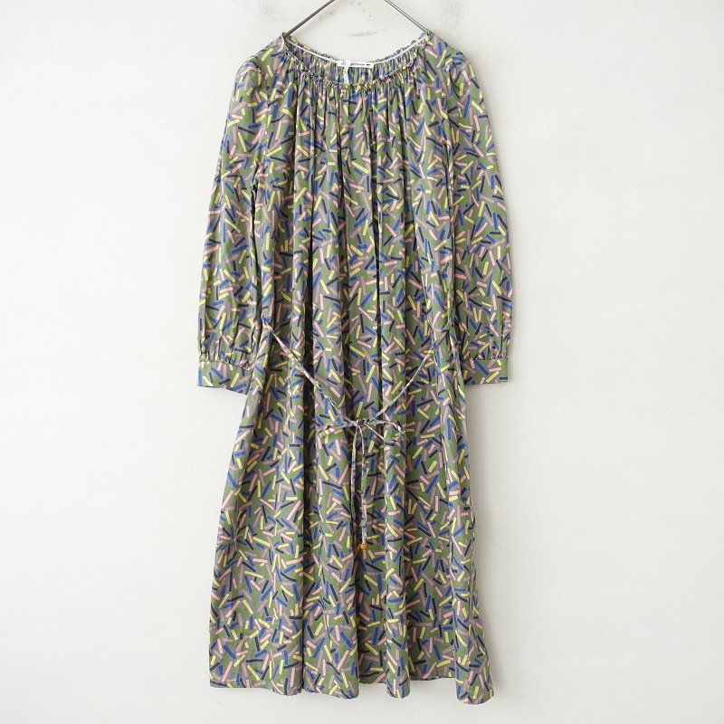 カラーなど:mina perhonenの「light stick」プリントネックギャザーワンピースです。カラーはグレー地×配色使いです。極細番手の綿糸で綾織りされ、表に微起毛を配した柔らかな薄手生地を使用。ネックラインにギャザーを寄せ、ピコカット仕様のフリルがあしらわれております。ウエストにはベルトループ&着脱可能の腰紐付きです。袖口はギャザーを寄せ、カフスの1ボタン留めです。ポケットはございません。定価(メーカー希望小売価格)60,480円の商品です。