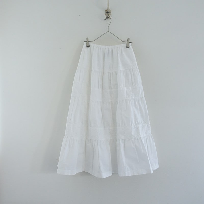 カラーなど:2025年春夏コレクション mina perhonenのtambourine ティアードスカートです。カラーはホワイトで、布帛地です。刺しゅう&ギャザー切り替えが施されたティアードデザインで、ウエスト総ゴム入りです。腰両サイドにシームポケットがあり、裏地付きです。定価(メーカー希望小売価格)82,500円の商品です。
