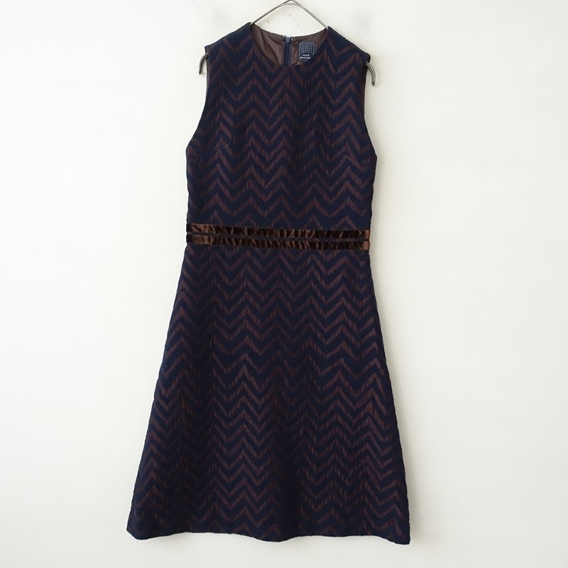 カラーなど:mina perhonenのcascade シェブロン柄ノースリーブドレスワンピースです。カラーは光沢のあるブラウン×ネイビーで、パイル刺繍があしらわれており、裏地が付いております。ウエストはベルベットテープが施されており、バックファスナー半開で着脱できます。
