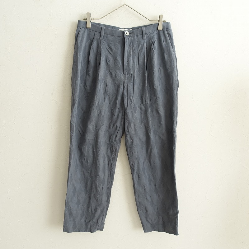 デザイン:mina perhonenのice light コットンダイヤ柄2タックテーパードパンツです。カラーはグレーで、ice lightテキスタイルのダイヤ柄の施されたコットン地で仕立てられています。開口部はボタンと比翼ボタンで、タックが施され、両腰&両ヒップにポケット付きです。
