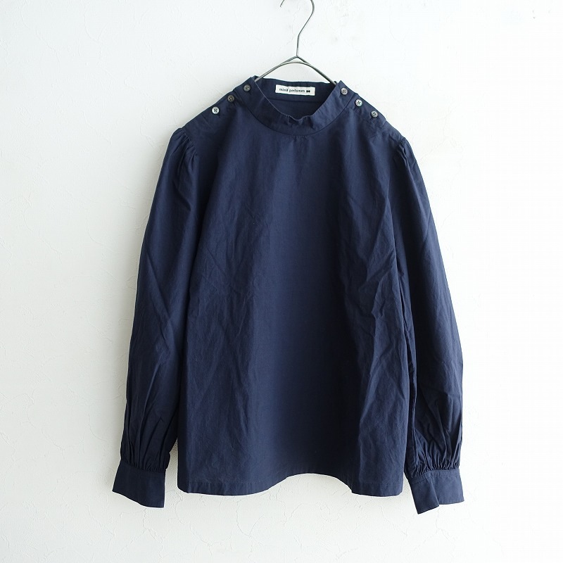 カラーなど:mina perhonenの「rakas」スタンドカラーブラウスです。カラーは紺色です。細番手のコットン糸を高密度に織り上げた、しなやかで程よいハリのある薄手生地を使用。透け感はございません。スタンドカラーサイドのボタン開きプルオーバーブラウスです。袖山と袖口にギャザーを配したパフスリーブで、袖口カフスの1ボタン留めです。ポケットはございません。