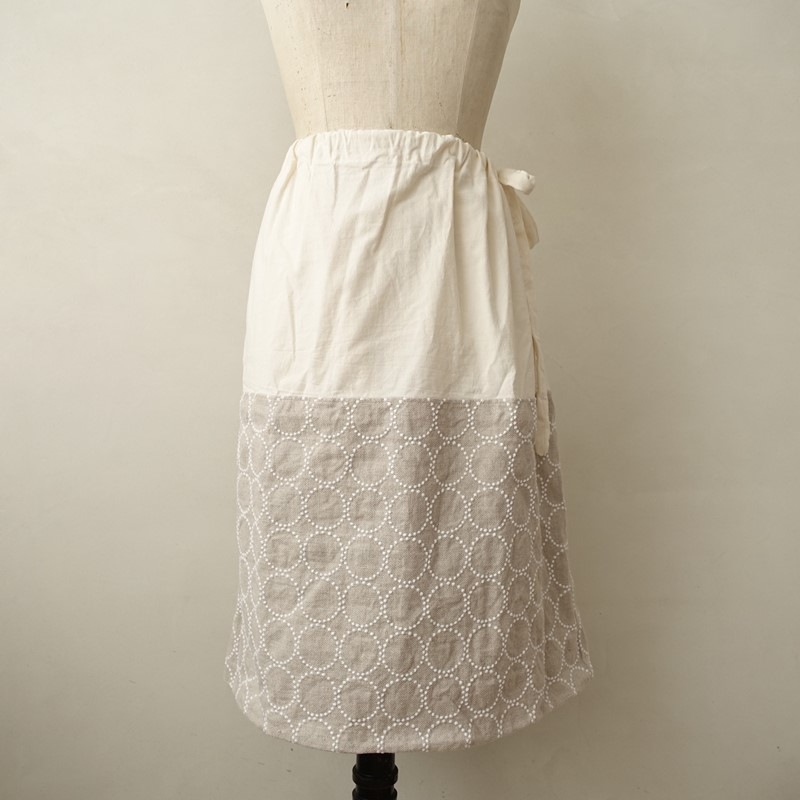 カラーなど:mina perhonen×momogusaのtambourine バルーンスカートです。カラーはアイボリー無地とベージュ地にtambourineのテキスタイル刺しゅうがあしらわれた生地の切り替えです。筒状のバルーンデザインで、ウエスト内側はゴム仕様、外側ウエストにはひもが通っており調整可能です。