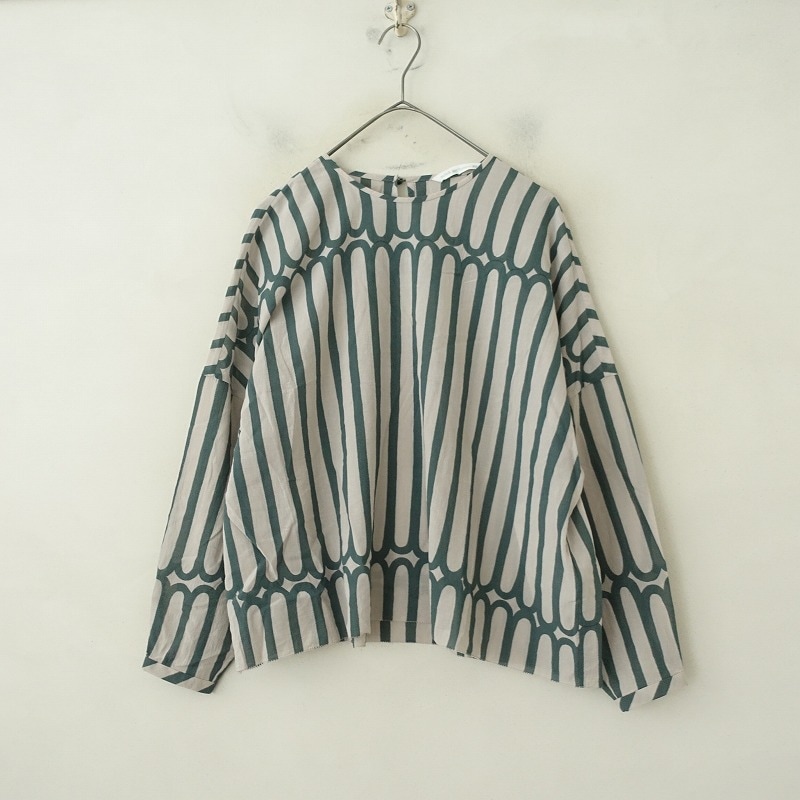 カラーなど:mina perhonenのfinger stripe コットンブラウスです。カラーはグリーン×グレージュで、やや透け感のある薄手素材です。バックセンタートップドロップホール付きループボタン1ヶ所留めのプルオーバータイプで、裾ふちはピコカット仕様になっております。