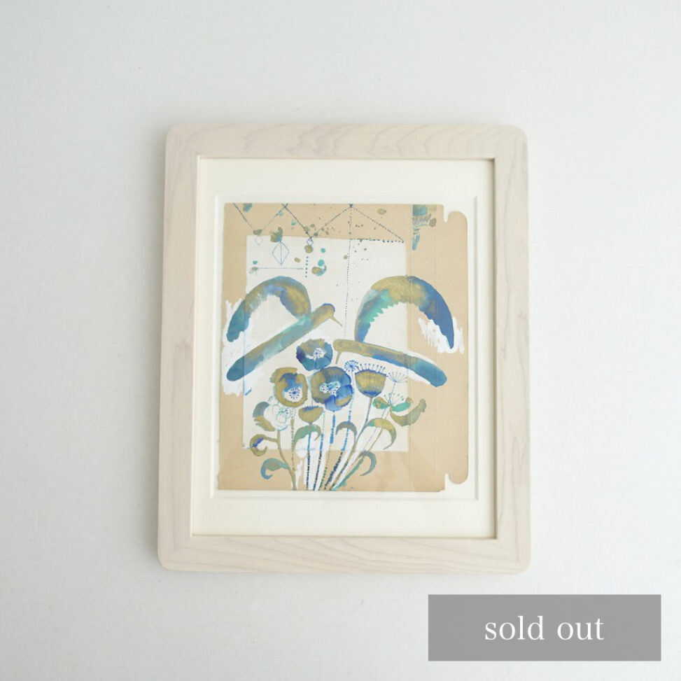 クラフト紙のような少し厚い紙に描かれており瑠璃色の濃い青とゴールドが映える絵です。
